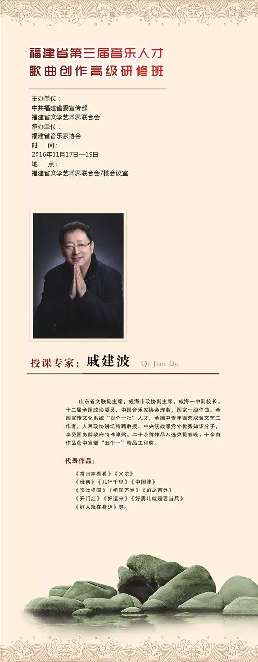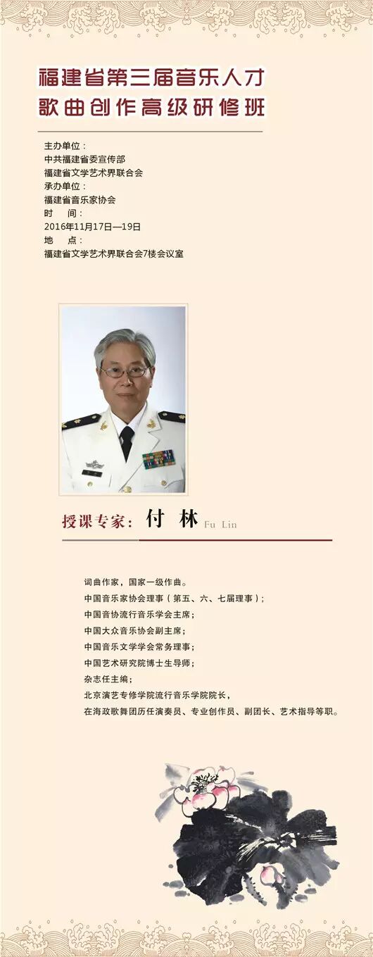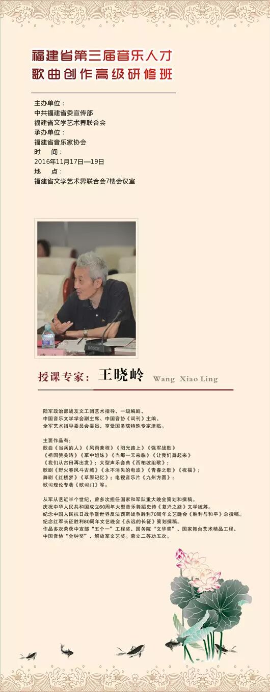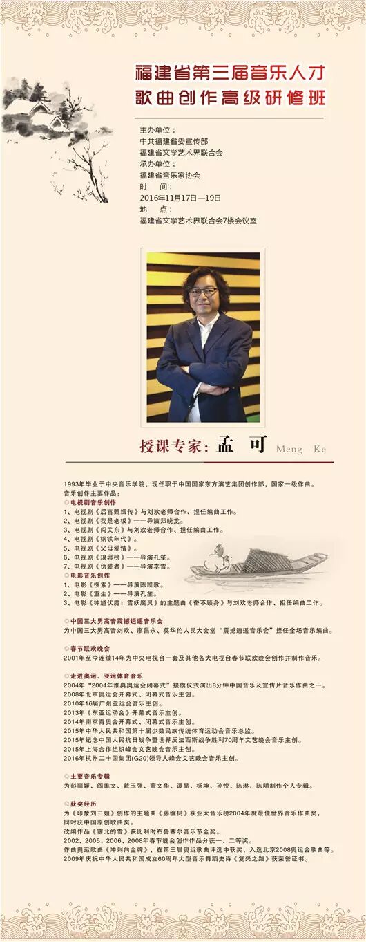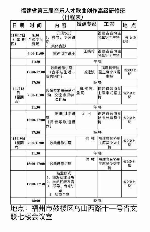 福建省第三届音乐人才歌曲创作高级研修班系列活动将于2016年11月17日至20日在福州举办,此次活动由中共福建省委宣传部、福建省文学艺术界联合会联合主办,福建省音乐协会承办,将邀请国内著名词曲家王晓岭、付林、戚建波、孟可举办音乐创作讲座。