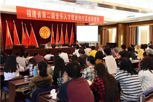 福建省第二届音乐人才歌曲创作高级研修班在榕成功举办,我省共计五十位青年词曲作者作为培训班的学员参加活动,第二届高研班邀请了中国当代著名作曲家张千一、著名词作家屈塬、著名作曲家张卓娅、著名作曲家王祖皆,对研修班学员进行授课。连续两届音乐人才歌曲创作高级研修班的举办,已经成为福建文艺品牌活动,为后续建设青年音乐人才创作队伍的提供强有力的支撑。