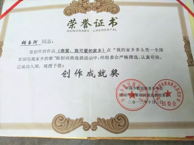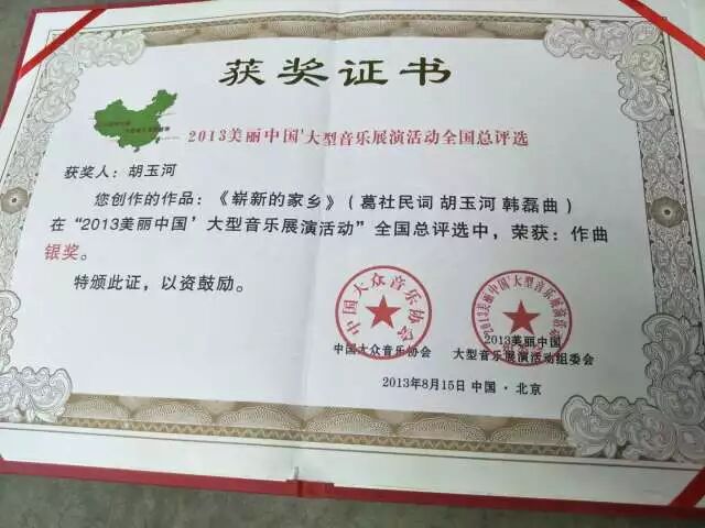 2013年作品《崭新的家乡》在全国总评选中,荣获作曲银奖;