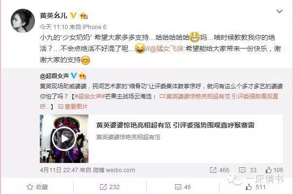 除了李小璐的堂妹参赛外,09年超女季军黄英也在微博发布消息称52岁的婆婆吕凤霞也参加了今年超女海选。随后一床情书于网络直播中看到,黄英婆婆吕凤霞首先大秀变脸,凭借活力十足的表演让评委感叹“像是25岁的少女”,而在才艺展示时,吕凤霞展现了软骨功,令三位评委齐呼“叹为观止”。
