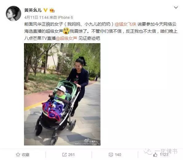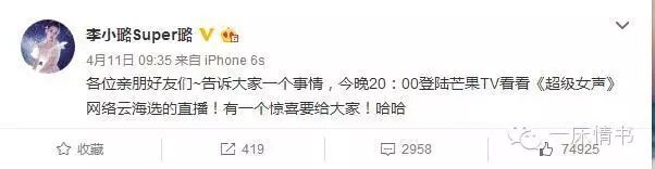 4月11日上午,李小璐发微博称“今晚20:00登陆芒果TV看看《超级女声》网络云海选的直播!有个惊喜要给大家。”随后立即引来粉丝们的围观和守候,有人调侃该不会是甜馨报名参赛了吧,也有人猜测或许是李小璐成为了选手,还有人猜测或许是李小璐一家三口坐镇评委席。