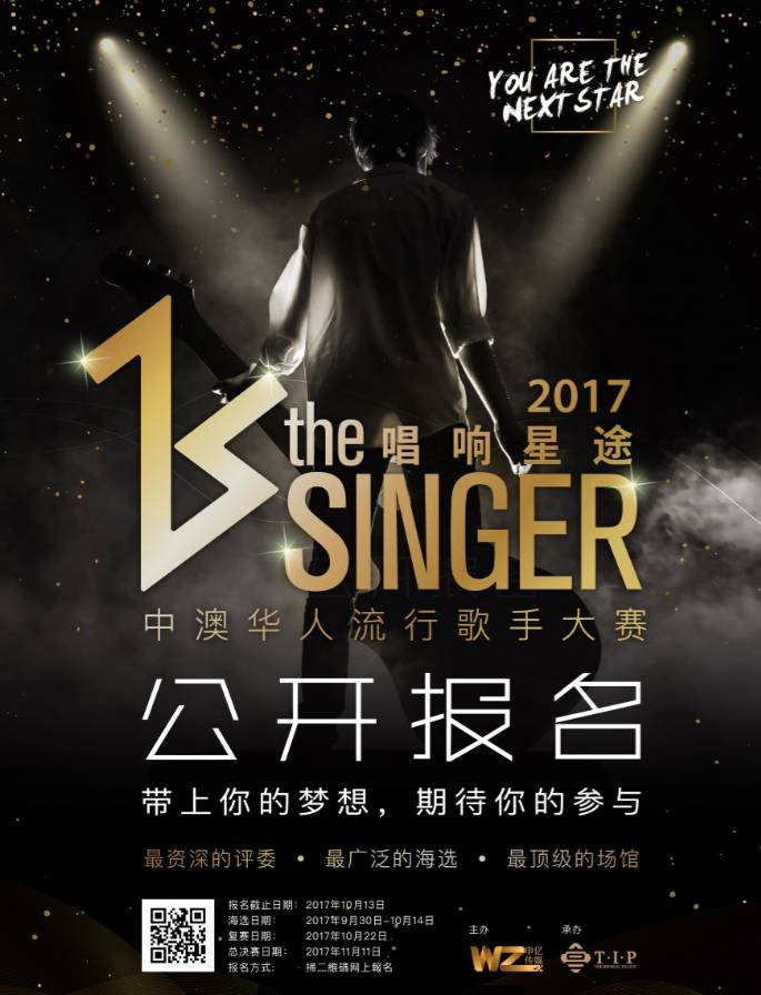 2017 The Singer 唱响星途中澳华人流行歌手大赛“火热报名啦!本次大型音乐选拔大赛是由WZ申亿传媒联合T.I.P宫传媒强力打造,澳洲赛区由AusTopMedia环澳传媒全程协办,就是等着在中澳两地挖掘有实力的你哦!