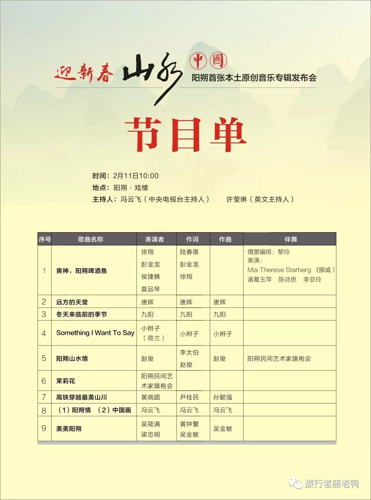 由广东音像出版社有限公司出版,阳朔音乐爱好者协会制作的阳朔首张本土原创音乐专辑《山水中国》发布会将于元宵节2月11日上午10:00在阳朔·戏楼(石马圆盘)举行。