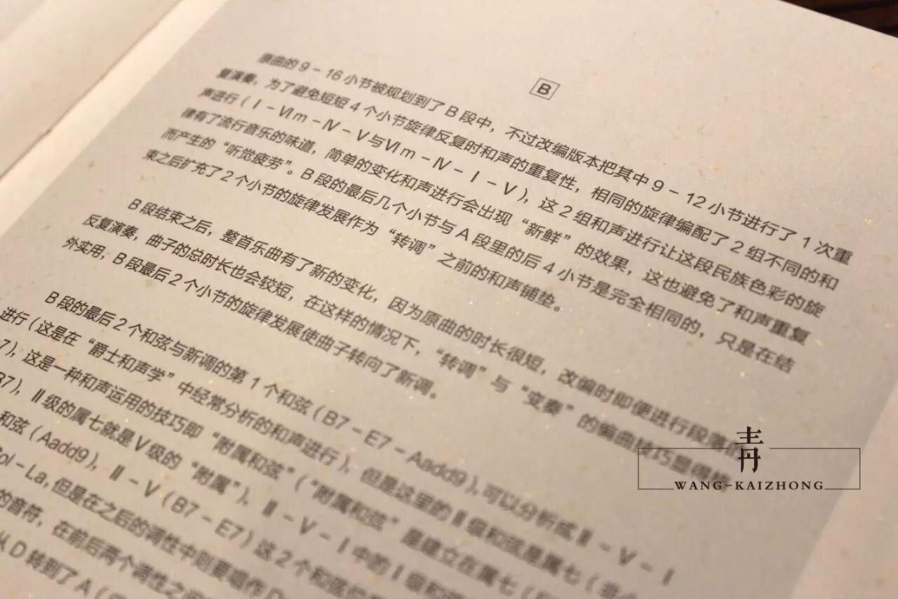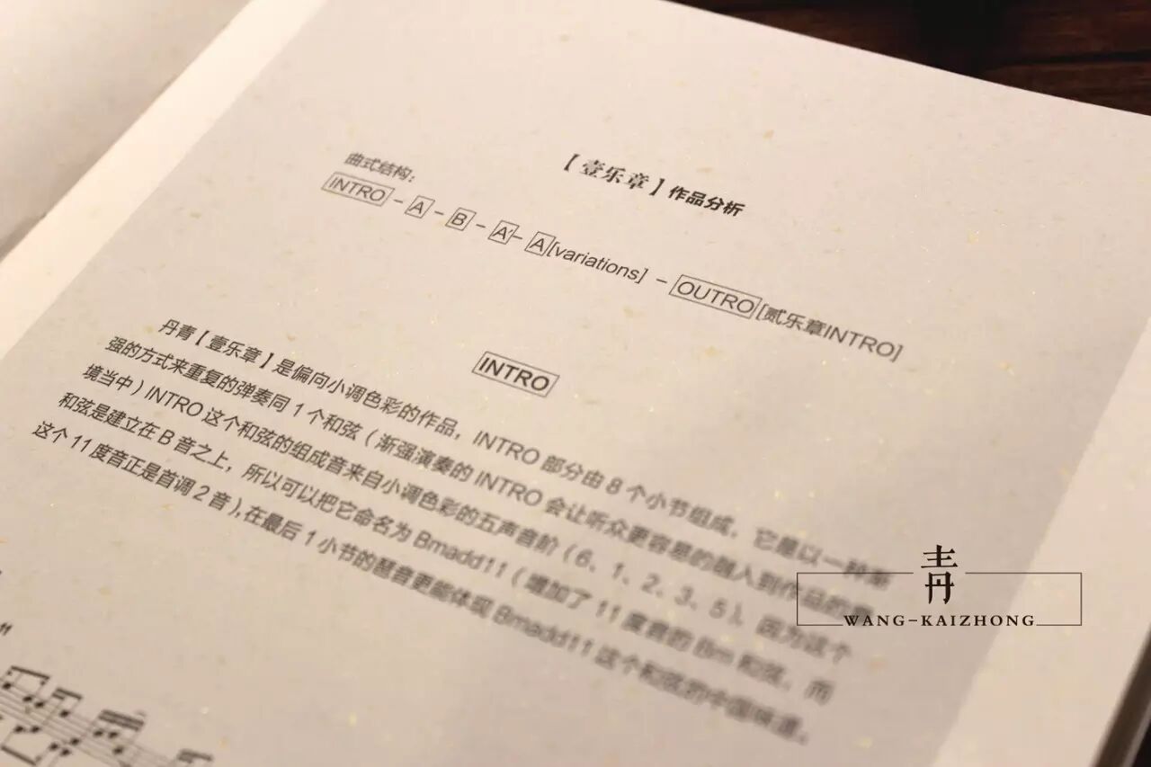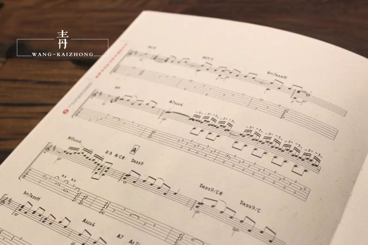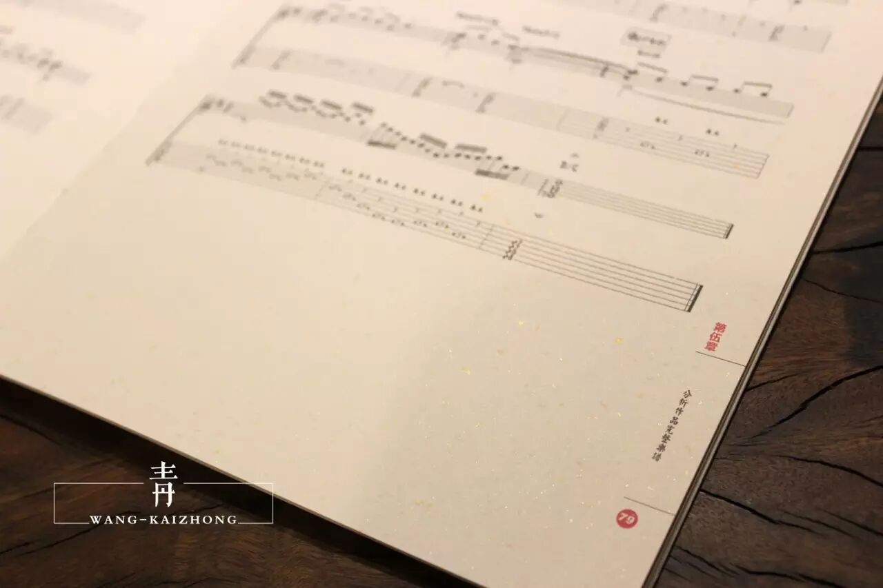 在本书的制作工艺方面,内页使用了锁线的装订技术,这会让读者可以把书平铺开来,方便视谱与学习,在内页的纸张方面,全部选用了带有金色暗纹且质感超好而昂贵"特种纸",加上贯穿整本书的"中式"排版,使得书籍的"内容"与整体"设计"更加相融,"全彩"的印刷与"紧致平整"且"精美"的透明塑封包装也提升了本书的"艺术性"与"美感",更开启了中国吉他类书籍"极致设计"的"装帧时代"。