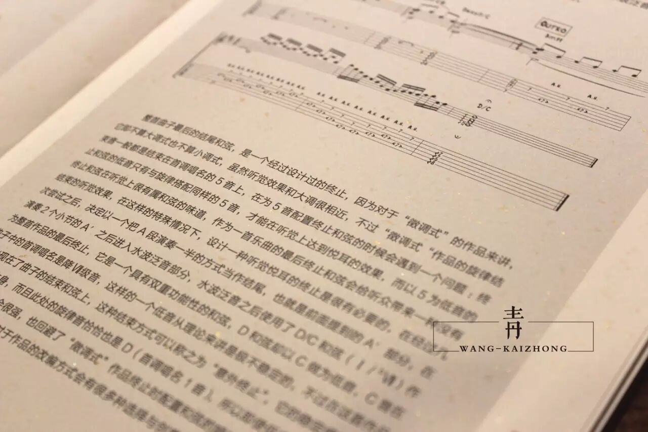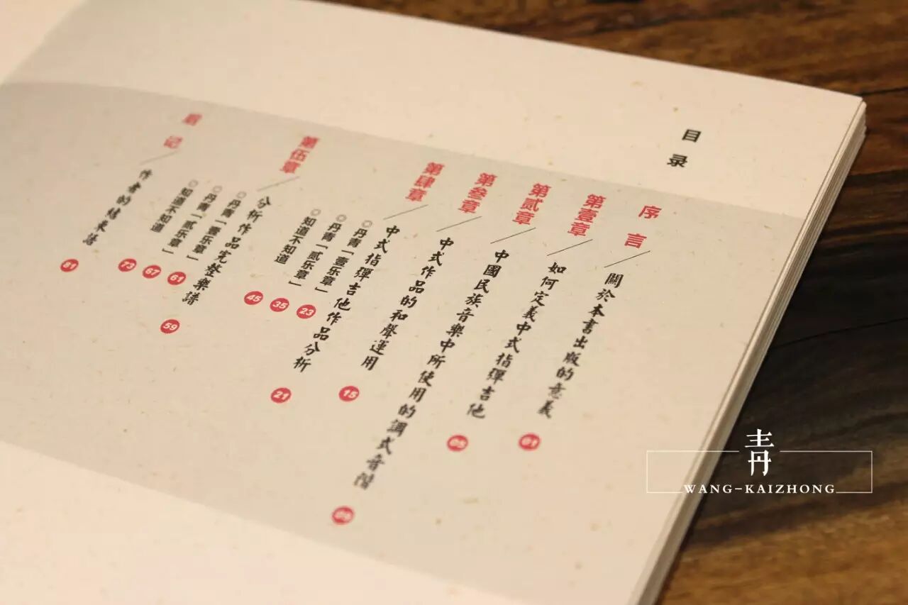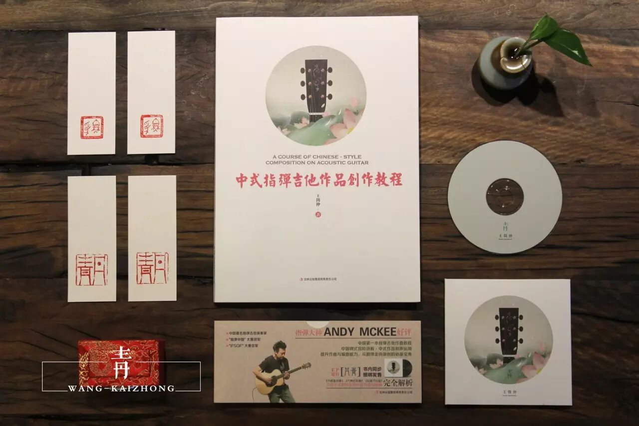 作者王开仲在2014年末出版了限量[1000套]的《中式指弹吉他作品创作教程》,书中从"概念"以及"乐理"与"和声"几个方面定义了"中式"指弹吉他作品的形态与特点,从"民族调式"与"民乐和声运用"以及作者本人原创作品的"作曲"与"编曲"详细解析等几个方面来教给大家如何创作"中式"指弹吉他作品。