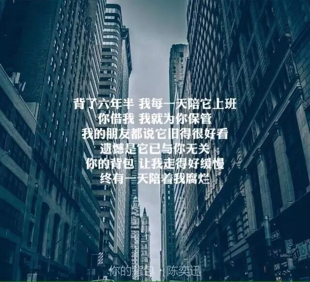 这首《你的背包》,虽然字里行间并没有直接指涉感情,但其实听完总有种淡淡的哀伤萦绕在心,这是为什么呢?其实这首歌里面也是充满了许多对感情不舍的暗喻,用背包来比喻付出的感情,象是「借了东西为什么不还」、「总有一天陪着我腐烂」等歌词,用古文的说法就叫做借物抒情吧!