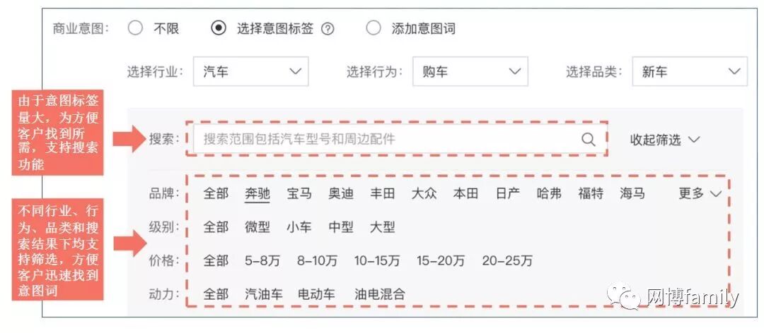 汽车4S店在无法确定意图词时可以利用意图标签做投放准备。