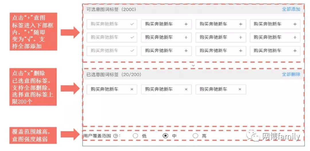 2.选取意图标签的范围,后台支持检索功能,大大减少了广告主的操作性。