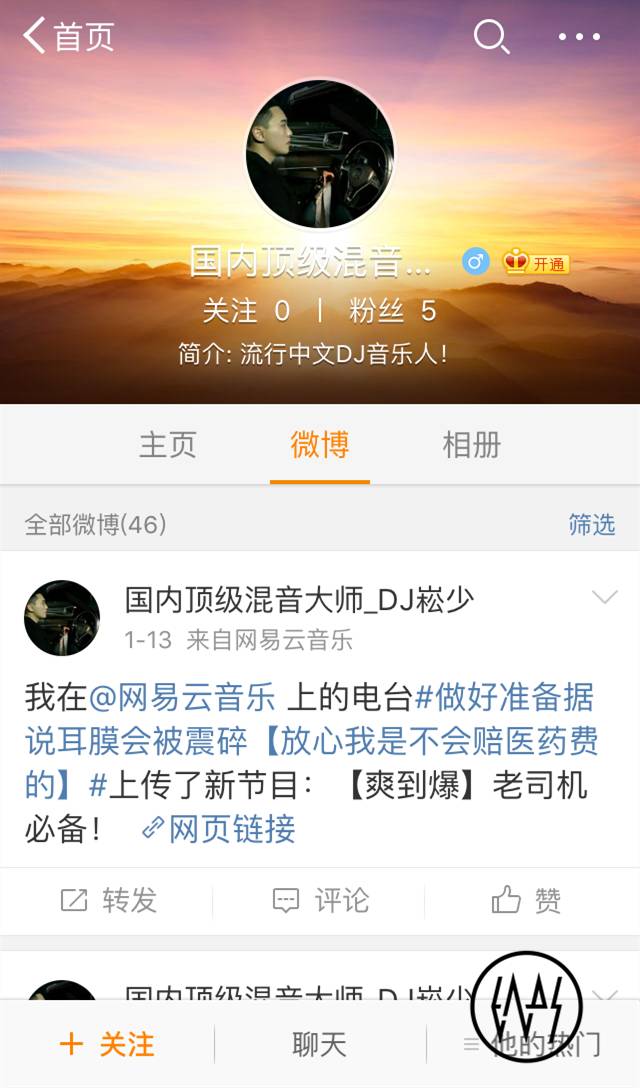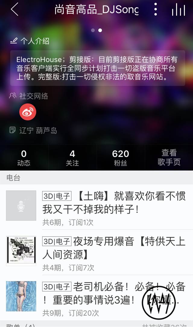 这只盗歌蛤蟆甚至给了自己一个类似于“电音之王”一样的美称,叫“国内顶级混音大师”,而音乐风格是“中文DJ”。