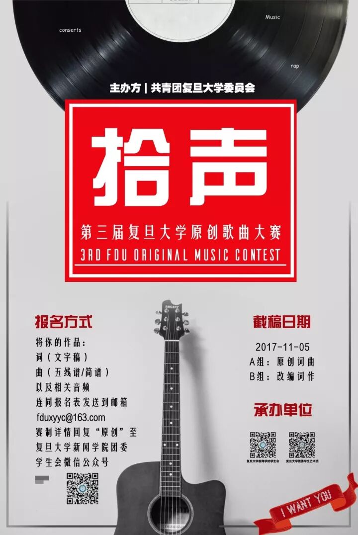 点击“阅读原文”,下载报名表。将个人作品【包括曲(五线谱或简谱)、词(文字稿)以及相关音频文件】连同报名表以附件形式发送到邮箱fduxyyc@163.com。请将邮件命名为:组别+姓名+联系方式。