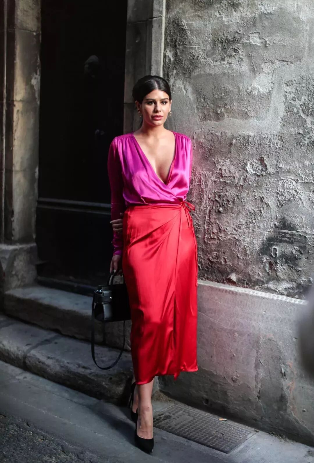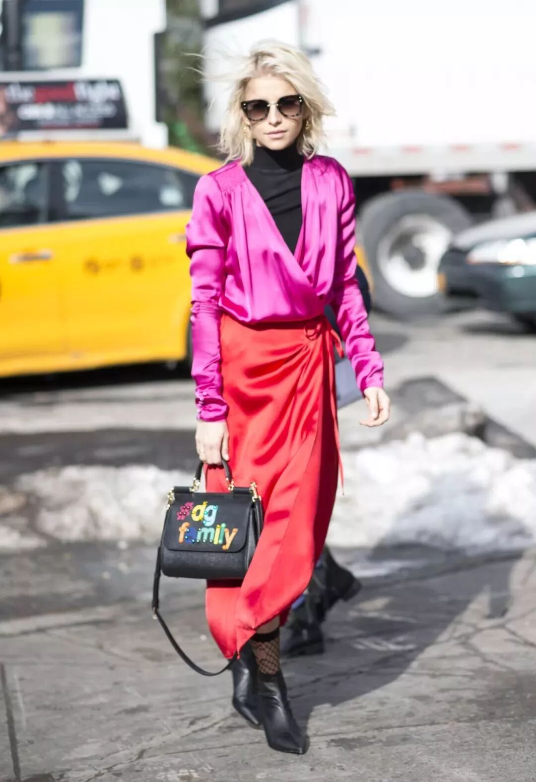 红+紫拼接,艳丽加倍,而技巧高超的时尚达人们也能穿出差异感。