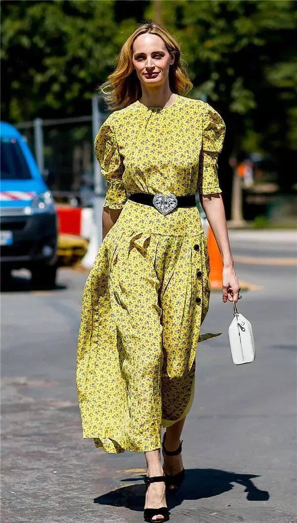 黄色自带明艳属性,但和星星点点的碎花结合,有时候难免看起来土气,因此穿着时避免“土气”是重中之重,比如尽量控制其它色彩的比例↓