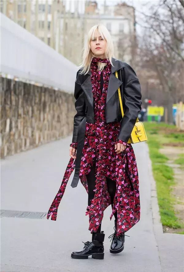 配上皮衣和短靴,就大大改变了裙子本身的气质,反而十分酷帅了,娘man平衡。