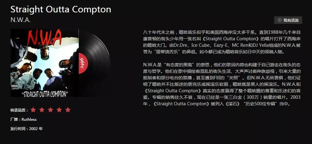 截图简介里面讲得很清楚,这是一张什么样的唱片。西海岸最能折腾的匪帮音乐的鼻祖。