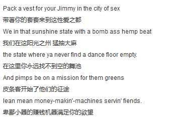 在这种商业包装下,诸如毒品,金钱这些,一直在历史上并没有被表现在音乐表面的东西才逐渐浮出水面。比如 2Pac 的《California Love》里面的歌词。