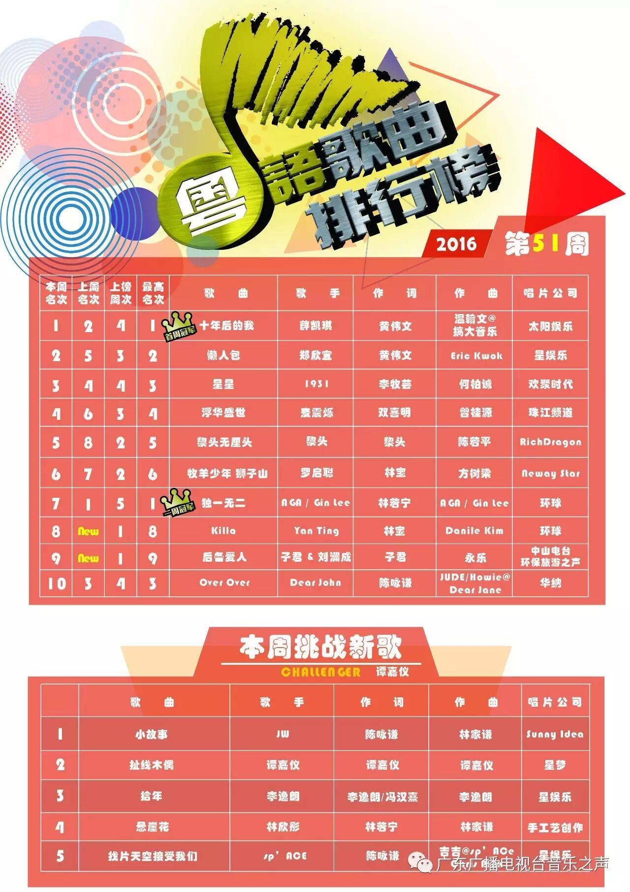 放榜日|粤语歌曲排行榜 2016年度第52周成绩:郑欣宜夺冠!