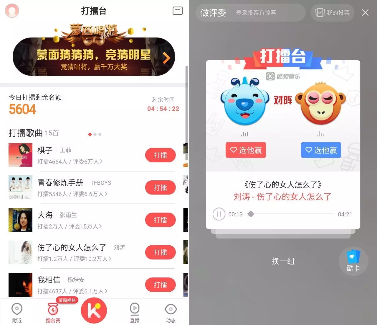 作为《蒙面唱将猜猜猜》的独家互动平台,酷狗音乐把节目竞猜元素平移到APP上,把场内观众竞猜延伸至全国观众竞猜,将节目最重要的“猜”体验广泛普及。网友可在酷狗音乐的“做评委”、和“打擂台”板块一边当评委为打擂歌曲投票,一边演唱指定歌曲进行随机PK,同时还能获取蒙面唱将身份的独家线索,可谓是将“音乐总有新玩法”发挥到了极致。