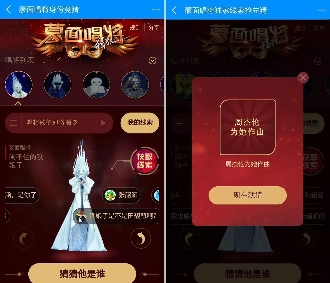作为国内独占鳌头的音乐类APP,酷狗音乐通过对市场的客观判断,很快掌握了观众的心理,开创了一种全新的模式,那就是将《蒙面唱将猜猜猜》与手机APP相结合,将节目元素平移到APP上,观众可以边听边看边玩边猜,可谓是趣味十足。