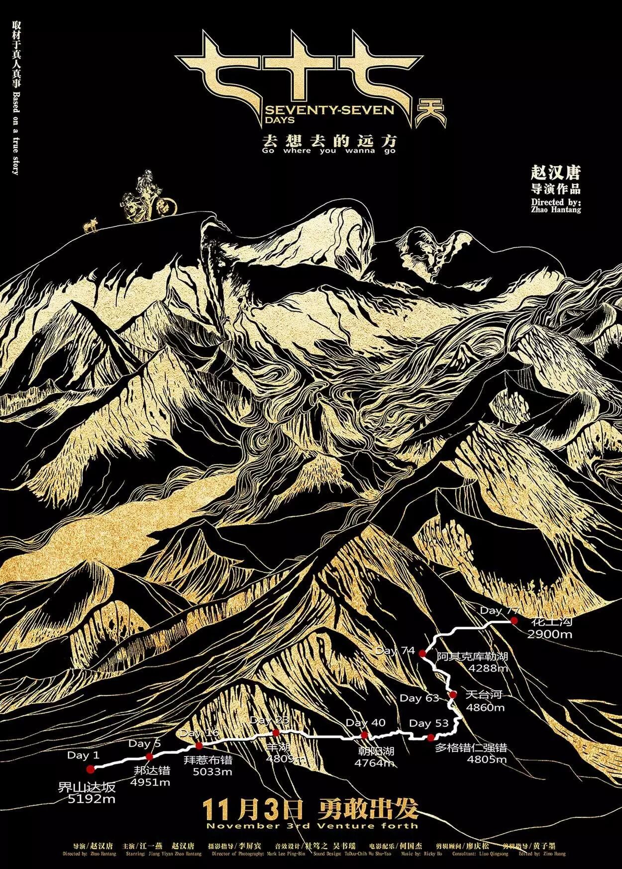 电影《七十七天》是以探险作家杨柳松77天孤身穿越羌塘无人区的真实事迹为蓝本创作。电影中,在生活里迷失了自我的男主徘徊在雪域高原独闯无人区,影片女主身体残疾仍然乐观面对生活,她让他坚定了去尝试世人眼里无法完成的无人区奇幻探险之旅……