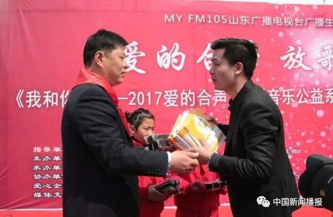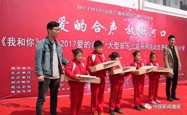 ,更好的实现针对乡村教育的精神扶贫精准扶贫工作,3月31号上午,山东省委宣传部、团委、妇联、广播电视台广播生活频道共同启动的《我和你》—2017爱的合声大型音乐公益系列活动之首场活动在枣庄市山亭区河口小学举办。枣庄市委宣传部副调研员李景龙、妇联副主席鲁海燕、团市委宣传部部长孙知博,山东广播电视台广播生活频道总监杨朝霞、省教育基金会活动负责人李潜,山亭区凫城镇千佛崖村第一书记郭彦滨,山亭区委组织部、宣传部、团委、妇联、教育局的领导及河口小学全体师生、附近村民等近300人参加了活动。