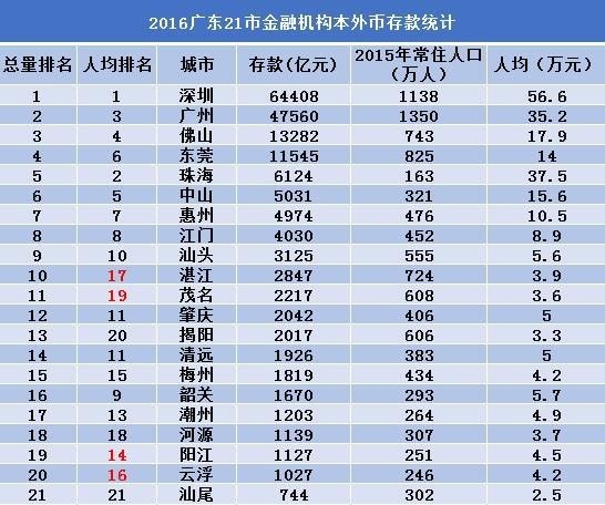 我们可以看到,除了比不上特区汕头,湛江、茂名的存款总额比粤东粤北各市都要高,但一平均下来就惨不忍睹了,不但比不过汕头、潮州,就连山区的梅州、韶关、清远都比不上,跟人家相差了一大截,湛江、茂名才3字头,韶关、清远都5字头了!河源下属5个县全部是省级贫困县,人均存款都有37000多元,一个贫困县都没有的茂名,人均才36000多元,这差距咋这么大呢!