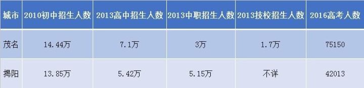 从表中可以看出,两市在初中阶段招生人数不相上下,初中毕业后茂名考生大多选择了上高中,而揭阳考生出现了明显分流,读高中与读职校各占一半;到高考,揭阳考生只剩下高中招生人数的77.5%,而茂名是招生人数的105.8%!这说明什么,说明不仅99%的茂名高中生参加了高考,连职校、技校也有相当一部分参加了高考,还有部分复读生。在茂名人眼中,读大学比什么都重要!