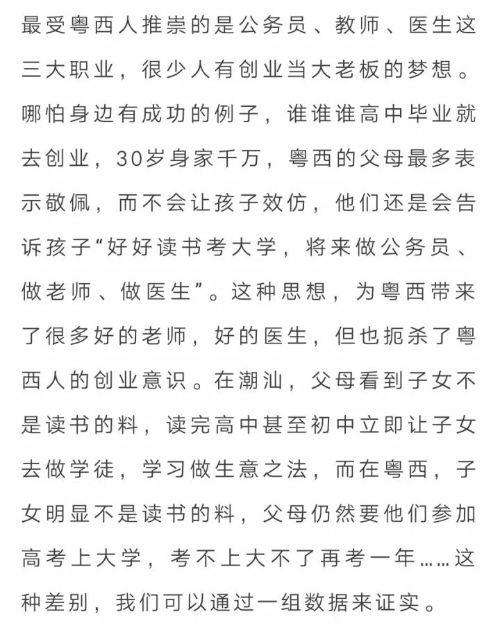 花在教育上了。教育是一个家庭沉重的负担,更是粤西人沉重的负担。粤西人有砸锅卖铁办教育的传统,千方百计要供孩子读书上大学,哪怕他根本不是读书的料。所以你看到高考榜上,茂名、湛江的高考生数量远超其他各市,参加高考考生比例之高令人吃惊。如茂名户籍人口分别是揭阳、韶关、清远、梅州1.1倍、1.88倍、2.38倍、1.44倍,高考生却是其1.79倍、3倍、3.5倍、2.02倍,湛江亦然。也就是说,相比粤东、粤北家庭,粤西人付出了多一倍的教育投入。虽然很多家庭的子女考上了大学,但他们的志向大多定位于从事公务员、老师、医生这类稳定的职业,回报有限,大半辈子挣的钱都在还以前的教育债,也许还不一定还得上,无怪粤西人人均存款那么低。