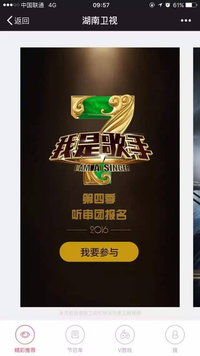 12月21日中午12:00起,打开电视机,观看湖南卫视→拿出手机,打开微信→点击“发现”→点击“摇一摇”→选择“电视”→摇动手机,即可进入湖南卫视微信摇电视页面,点击我是歌手第四季听审团首页,进行报名!