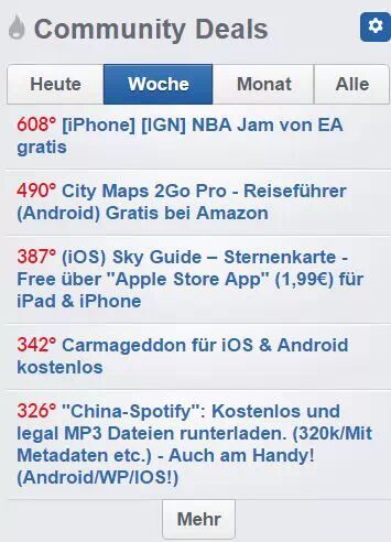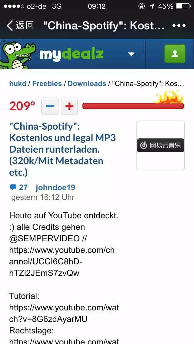 mydeals是德国分享便宜货的网站,每天都有很多打折信息,然后根据热度排序,你觉得好可以升温一下,今天德国人发现了网易云音乐,下载正版音乐都是免费的,于是他们像发现金矿一样蜂拥而至,不仅列出了视频教程,而且还关于合法性展开了深刻的讨论……