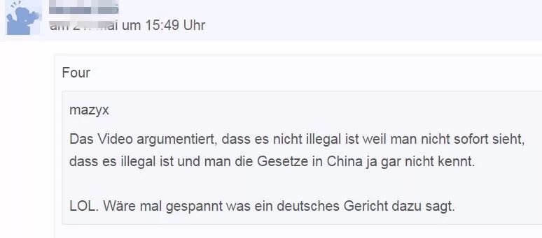 视频教程片头的“……大家知道在咱们德国,下载传播盗版是抓得非常紧的!但是既然咱们是在网上,那咱们就只要遵循网站所属国家法律就好了~例如中国……那可真是个好地方,那儿的法律允许好多咱们这儿已经禁止好久的事儿”(……in China Z.B. Da sind Sachen erlaubt, die sind bei uns noch lange nicht erlaubt …)