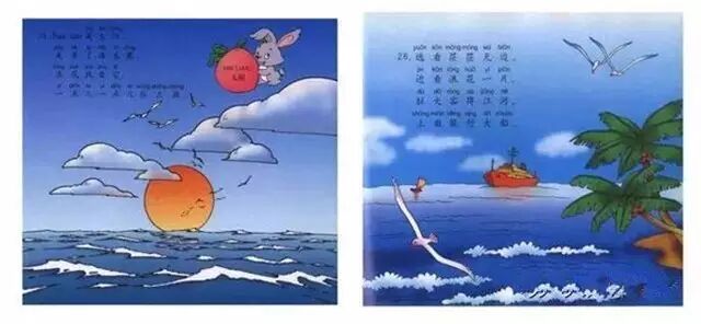 同样是表现大海,请看这两幅常见儿童读物的插图。绘画作者不是同一个人,上色的也不是同一个工作室,也不是由同一个出版社出版的,出版时间也不相同,但是我们看到这两幅画却非常的相似,大海都是蓝的,太阳是红的,树是绿的,都是单调的固有色。