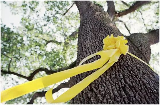 1971年10月14日《纽约邮报》刊登了一个故事, 故事的名字叫《回家》: 长途车上坐著一位沉默不语的男子, 在同车的年轻游客的盘问下终于开了口。 ,释放前曾写信给妻子 如果她已另有归宿, 他也不责怪她;如果她还爱着他,愿意他回去, 就在镇口的老橡树上系一根黄丝带;如果没有黄丝带, 他就会随车而去,永远不会去打扰她……汽车快到目的地了, 车上的人们都坐在靠窗户的位上往外看,只有这位男子不敢张望, 他害怕迎面而来的可能是失望……突然间, 全车的人都沸腾起来:远远望去, 镇口的老橡树上挂了几十上百条黄丝带, 这些黄丝带像欢迎的旗帜迎风飘扬…… 这个故事刊出不久,很快就出现了这首不朽的音乐作品。这歌动人的故事被作成了歌曲Tie A Yellow Ribbon Round The Ole Oak Tree(老橡树上的黄丝带),伴著歌声这个故事也传遍了全世界。 黄丝带也成了美国“欢迎被囚禁的人重获自由”的标志。
