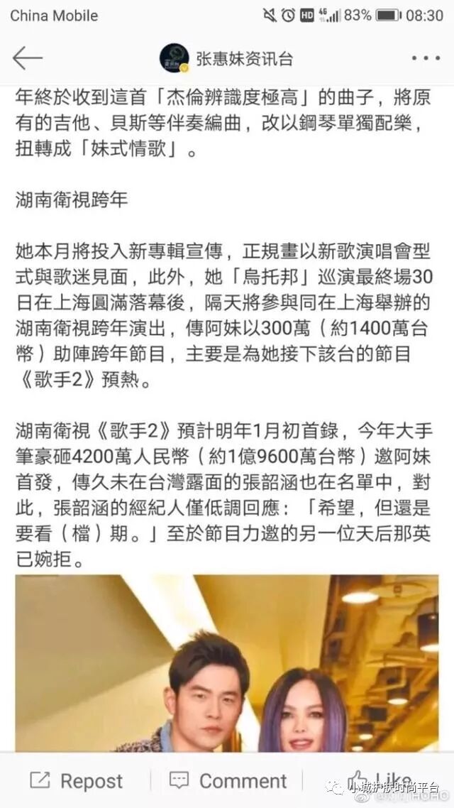 据了解,此次湖南卫视《歌手2》豪砸4200万人民币邀请张惠妹首发,可以说是大手笔。据悉,张惠妹近期会准备演唱会以及湖南卫视的跨年演唱会,然后明年一月初录制节目。如果张惠妹参加的话,夺冠可能性则非常大。