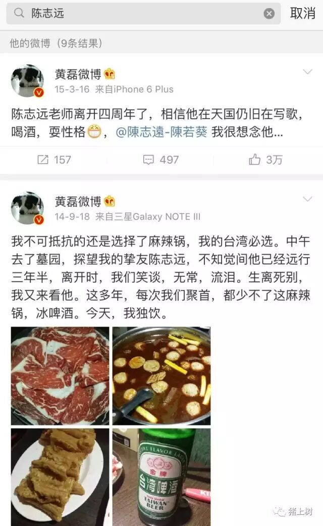 在黄磊的微博搜索陈志远,9个结果,不固定的时间,想起来就会写一段怀念