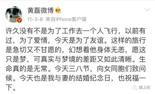 2011年3月8号,黄磊突然在微博中写道:“许久没有不是为了工作去一个人飞行,以前有过,为了爱情,今天是为了友谊。这样的旅行是急切又不甘愿的,幻想着他身体无恙,愿这只是梦,可真实与梦境的差距又如此清楚。”