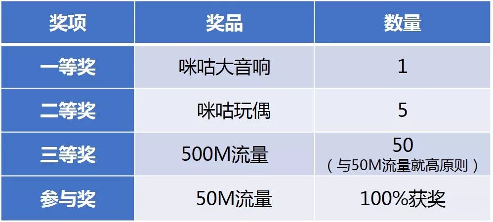 12月23日-12月27日期间只要你下载咪咕音乐,添加你最喜欢的歌曲至个人歌单(至少10首歌),分享至朋友圈,并将咪咕歌单转发至朋友圈截图+福州移动号码发至福州移动官方微信上即可参与活动,参与的客户100%可获赠50M流量,前50名参与的用户升级扩容为500M流量,其中第8、18、28、38、48名可获赠咪咕玩偶一个、第88名获赠咪咕音乐大音响一个。