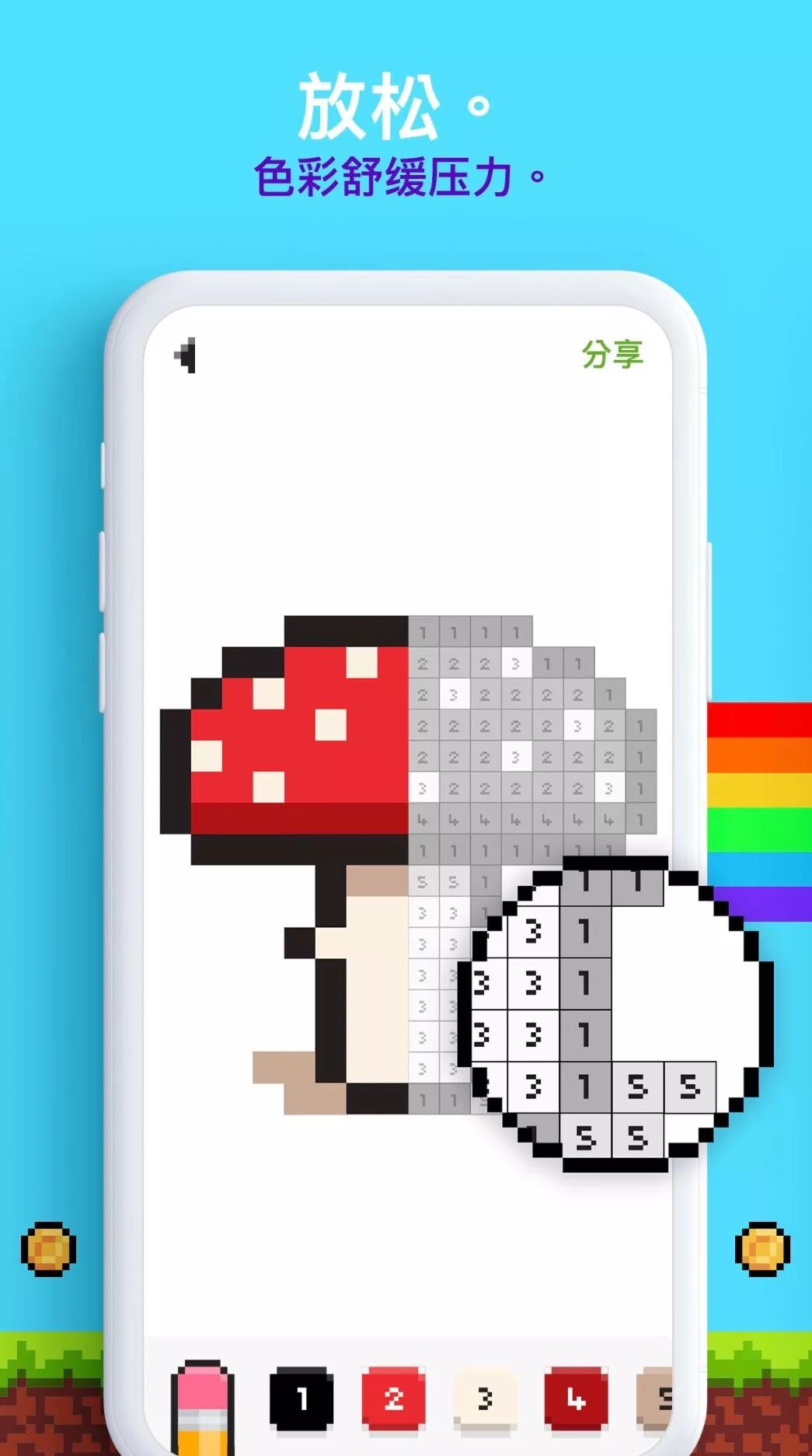 这个应用吧,emmm...喜欢的会很喜欢,无感的会很无感,反正我一开始就会停不下来,狂点哈哈哈!简单说就是给像素画上色,每个色块都标有数字,给相同的数字统一上色。最后出成品的时候还是蛮有成就感的233,比其他同类相比,胜在可以上传自己的图片涂色,拿来做头像也够特别啊~