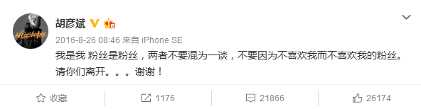 隔天,胡彦斌在微博手撕郑爽粉丝,礼貌称“请你们离开”。