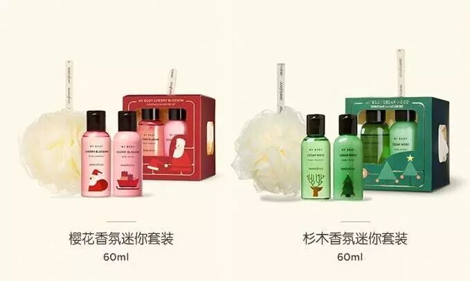 由沐浴露,身体乳及沐浴球组成,樱花及杉木两种香型,让你的圣诞充满水润香气的香氛迷你套装。清新舒爽的中性木香型杉木,可人香甜的花果香型樱花,两种不同香型任你选择。官网价55rmb