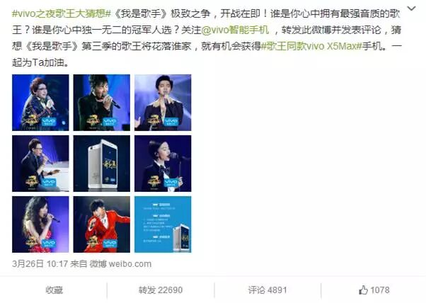 vivo智能手机在《我是歌手》一众合作伙伴中脱颖而出,在宣传力度上甚至一度超过了冠名商。