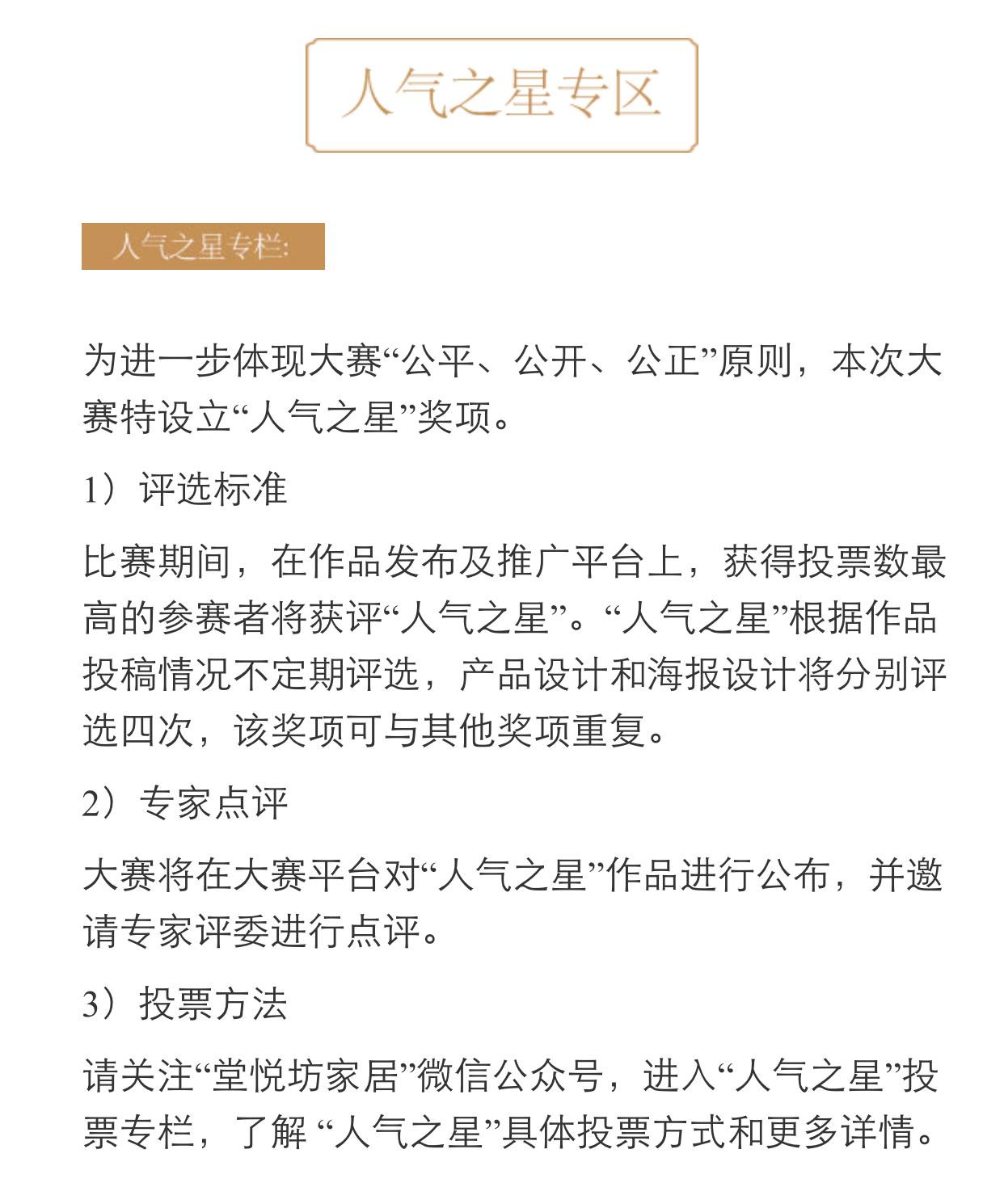 2.比赛期间,在作品发布及推广平台上,获得投票数最高的参赛者将获评“人气之星”。“人气之星”根据作品投稿情况不定期评选,产品设计和海报设计将分别评选四次,该奖项可与其他奖项重复;请关注“堂悦坊家居”微信公众号,进入“人气之星”投票专栏,了解“人气之星”具体投票方式和更多详情。