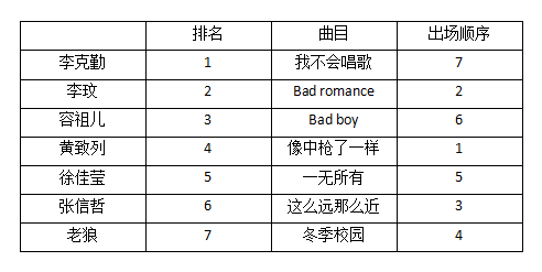 在这期节目中,李克勤以一首《我不会唱歌》夺得了第一名的成绩,他甚至还请来了郎朗为自己伴奏,观众也是被吓到了吧!第二名是发挥一直稳定的李玟,这期中她选择了Lady Gaga的《bad romance》,而容祖儿则以一曲张惠妹的《bad boy》排名第三,与前几期相比,大家都选择了更为保守的曲目。