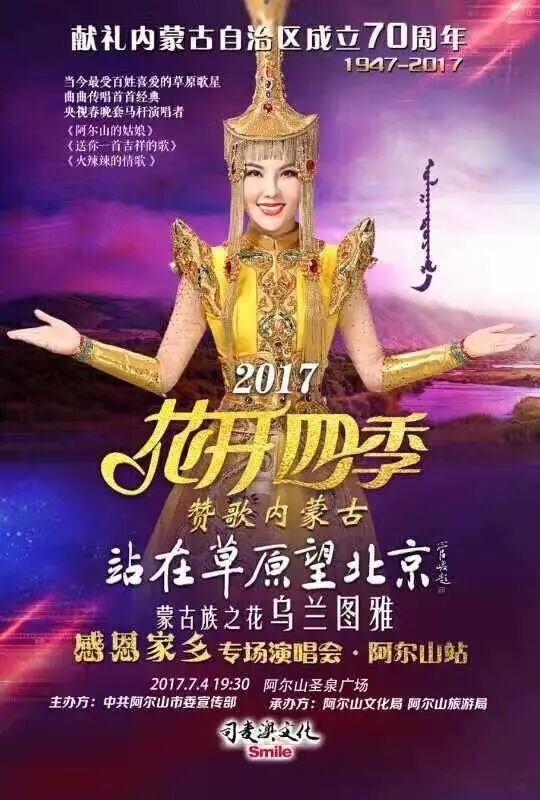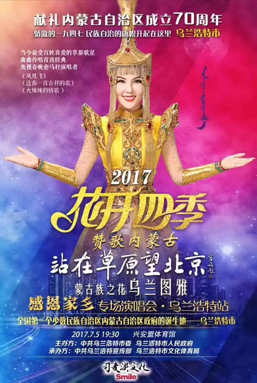 乌兰图雅,著名蒙古族青年歌手代表,毕业于中央民族大学,是当今最具国际影响力最受百姓喜爱的一代草原歌星,中国最具代表性的新生代草原新民歌开创者。其经典代表作《套马杆》、《站在草原望北京》、《我的蒙古马》、《送你一首吉祥的歌》、《阿尔山的姑娘》、《祝福歌》等等,首首耳熟能详,首首红遍大江南北,广为传唱。乌兰图雅还首创“花开四季”品牌演唱会。