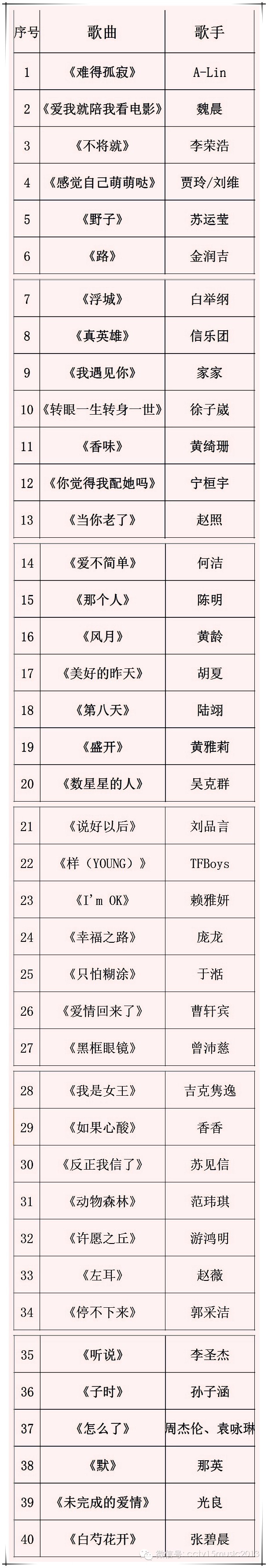 回顾完上周六晚的节目内容,重点来啦!本周六晚我们的榜上榜又会闹出哪样的精彩呢?话不多说,本周40首候选歌曲先给大家看下!