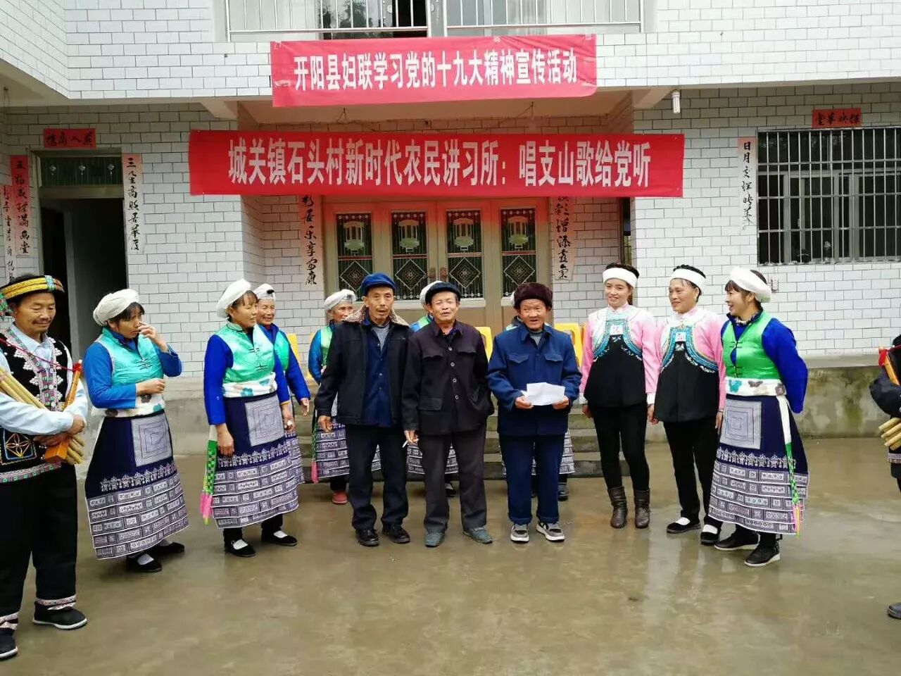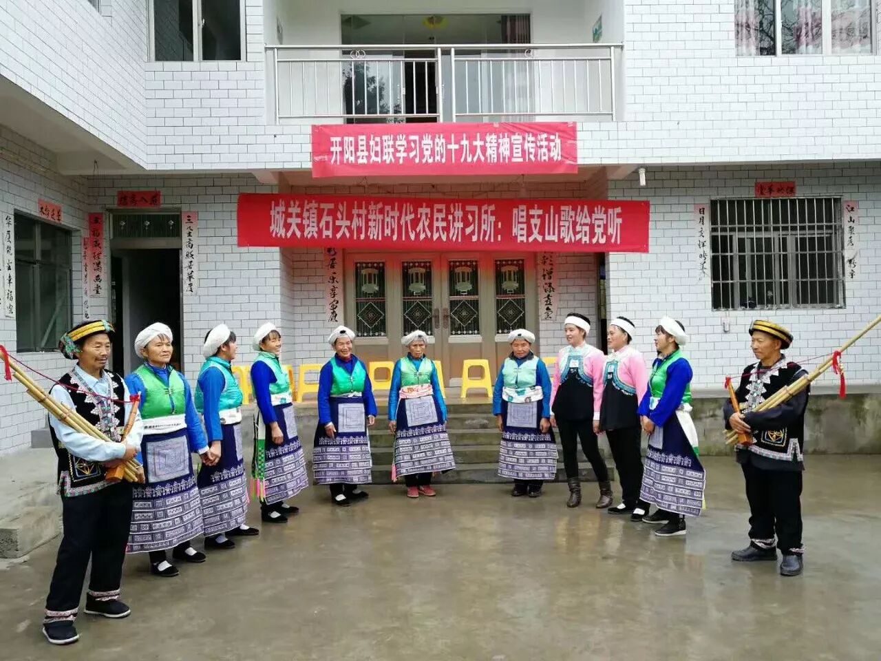 11月17日,开阳县妇联在城关镇石头村湾田组开展党的十九大精神宣传活动。当地村民自发组织,跳起芦笙舞,用朴实的少数民族语言将党的十九大精神编成歌曲,以唱山歌的独特形式宣传十九大精神,歌颂党恩。歌曲朗朗上口、喜闻乐见、易于接受,很受欢迎,歌声中表达同胞们将继续在党的领导下开创美好明天的信心和决心。