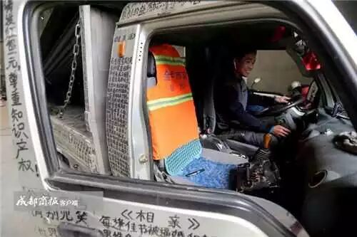 何先伟的货车很破,车头前有大大小小的坑,保险杠用锈迹的铁丝固定住,何先伟拉开车门,车窗窗框受力后大幅度地晃动。车身上,从车外到货车车厢的内侧,黑色的记号笔写满了歌词。
