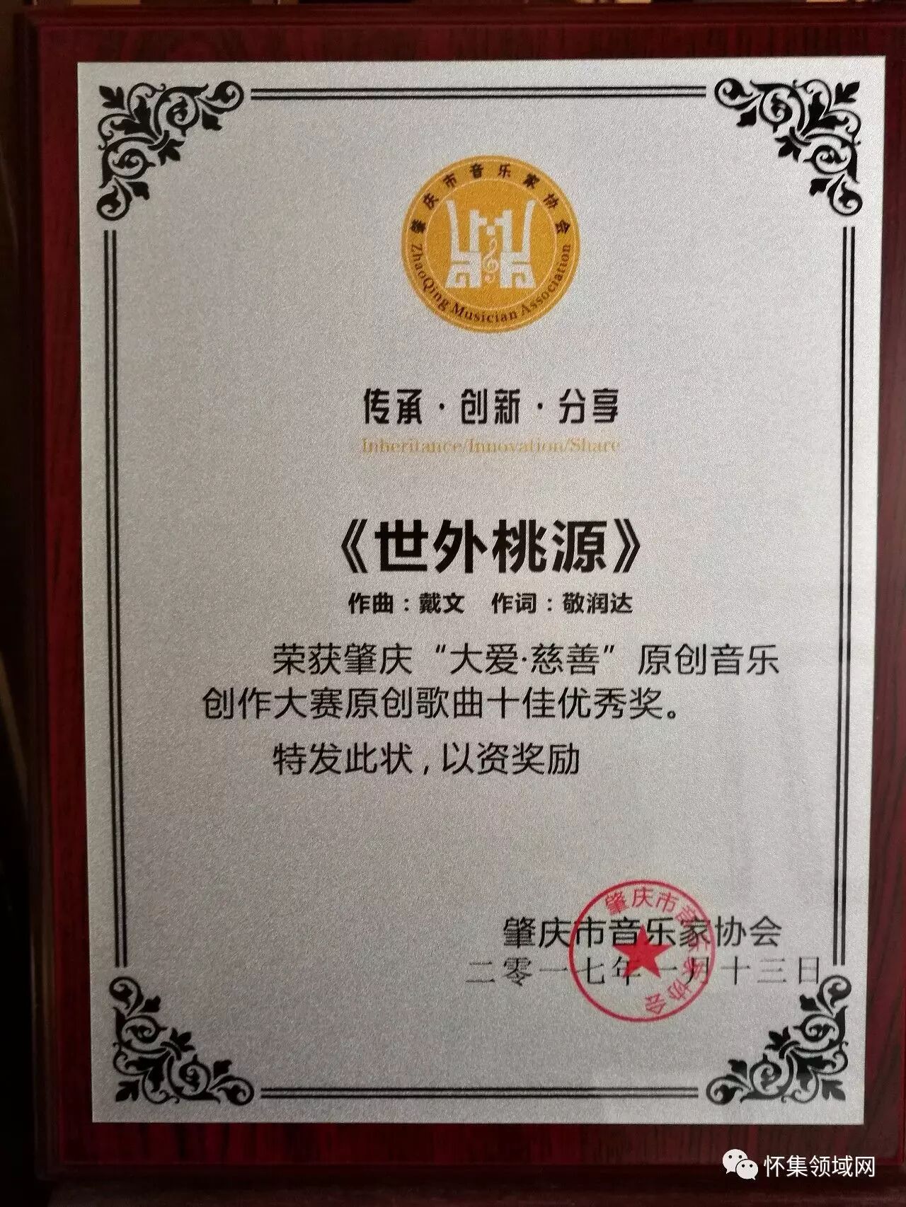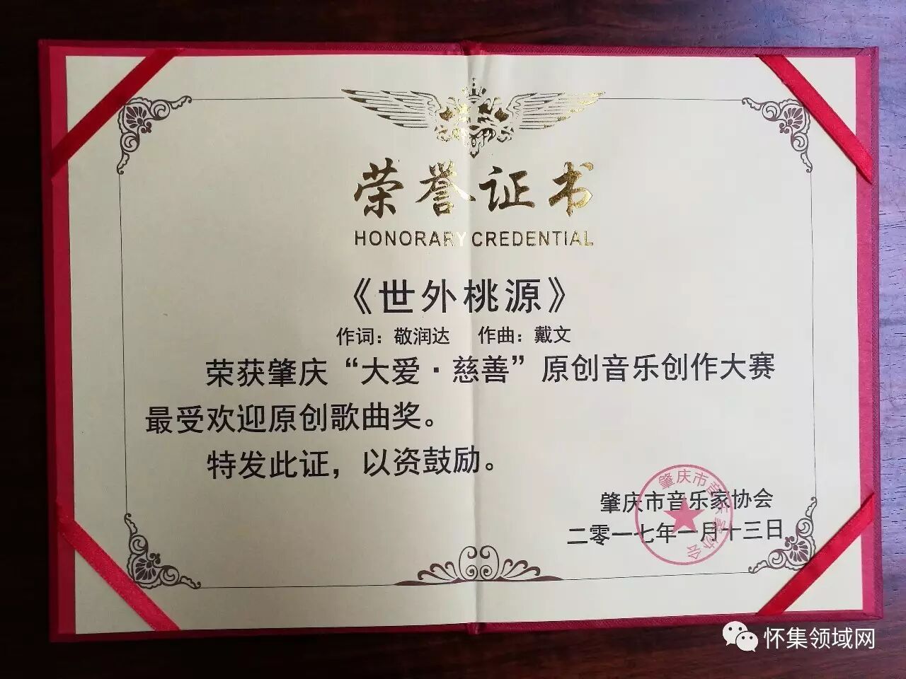 我县音乐协会副主席敬润达作词,戴文作曲的《世外桃源》获得肇庆市“大爱·慈善”原创音乐创作大赛十佳优秀歌曲奖。市音协会员,县音协理事徐琼武在音乐会上倾情演唱了《世外桃源》这首歌,博得满堂掌声。