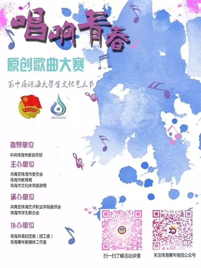 本次大赛以“唱响青春”为主题,是为培养大学生的创新精神和文化素养而开展的一项以创作原创校园音乐作品的文化活动,旨在发现、培养大学生音乐人才,传播原创校园音乐,通过竞赛选拔的方式为高校学生搭建音乐交流平台。1、参赛者必须为报名作品的词或曲作者,参赛曲目因版权问题产生的所有责任由参赛者承担,与组织方无关。3、参赛歌曲时间不超过6分钟。不得抄袭和剽窃,一经发现,立即取消参赛资格。7、作品内容反映当代大学校园生活和大学生精神面貌,内容以积极向上、主题鲜明、富有时代感;体现积极进取,奋发向上,刻苦钻研,勇于创新的大学生活。1、请各参赛者将参赛作品刻录成CD,并在封面上注明作品名称、作者姓名及联系方式,参赛作品中不得出现所属高校名字;连同报名表提交到各高校联系人处,以高校为单位且在11月1日前(邮寄作品时间以寄出当天为准)填好汇总表一并寄到珠海艺术职业学院(团委),各高校在宣传发动时须注明本校作品上交方式、联系人等信息。2、电子版报名表及电子音频一并发送至珠海艺术职业学院团委邮箱zytuanwei@126.com。3、邮寄地址:广东省珠海市金湾区红旗镇广安路2号珠海艺术职业学院(团委)。邮编:519090。联系人:代儒雅,18666965686;陈培玲,13570647029。1、初赛采用开放形式进行,报名结束后,大赛组委会组织专家进行初审,初赛将选出成绩前20名进入决赛。2、决赛组织专业评审进行评分决出一、二、三等奖,并在“珠海青年”(ID:zhyouth001)微信平台上公布,接受公众投票,决出最佳人气奖(由网络投票票数最高者获得,如有发现网络刷票以及各种作弊行为,取消其参赛资格)。1、“最佳人气奖”将通过“珠海青年”微信平台投票选出。