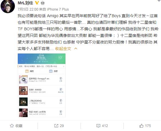 刘佳还坑过TFBoys,为什么这么说呢,《青春修炼手册》、《宠爱》是他创作的,现在这两首歌这么红,佳又把版权收回捧自己的组合。嗯~