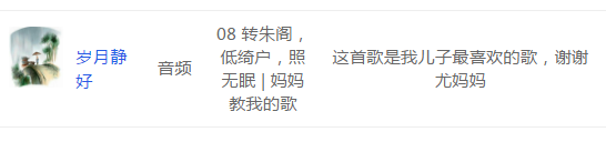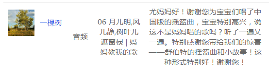 孩子爱听,也愿意跟着哼唱,更容易让孩子和妈妈有更多的记忆及回忆。孩子和妈妈对《妈妈教我的歌》认可,是我们致力并感到欣慰的: